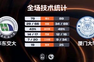 末节比赛,华东交大虽然有追分的势头,但厦门大学总能及时给出回应,即使在比赛结束前华东交大将分差追回到个位数,也因比赛时间所剩不多未能获得逆转机会,最终厦门大学战胜华东交大成功晋级。