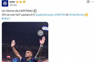 复出双响!国米官方:劳塔罗当选国米vs罗马的队内MVP